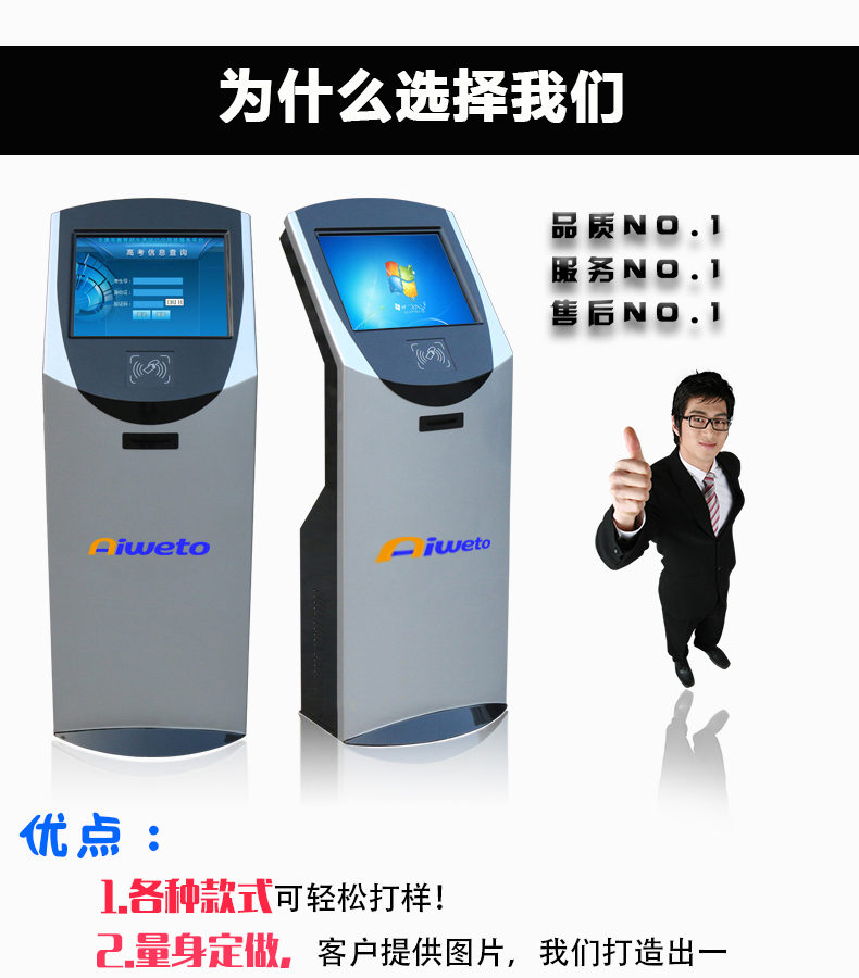 17”19”觸摸屏查詢一體機(jī)是一款智能觸摸查詢設(shè)備。它集觸控、液晶顯示、電腦主機(jī)于一體,可用于觸控互動、查詢信息多媒體教學(xué)等。觸摸一體機(jī)主體由流暢的直線構(gòu)成,簡約,時尚,符合現(xiàn)代社會流行趨勢。整體造型設(shè)計利于人體機(jī)學(xué)設(shè)計,使用戶擁有更舒適、更便捷、 更貼心的視覺觸覺雙重體驗。